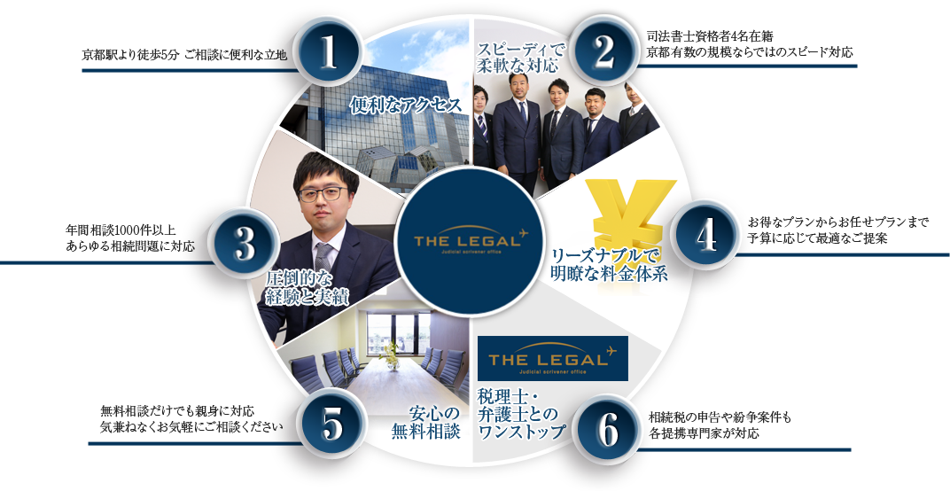 相続は当事務所のような司法書士の資格者だけでなく、税理士や弁護士、社会保険労務士など、ケースに応じて多くの専門家に相談する必要があります。当事務所では、各お客様にどの専門家が適任なのかを適格に判断し、京都、大阪、大津を中心とした各専門家と連携しながらお客様のお悩みを解決いたします。